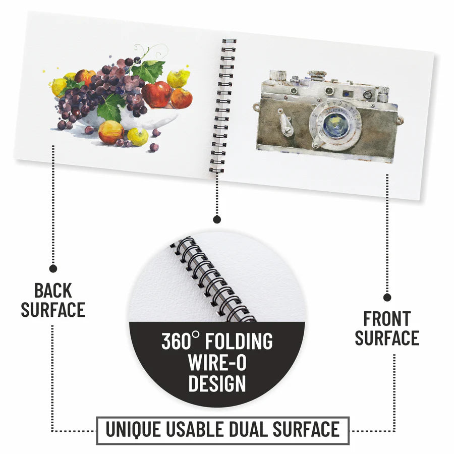 Crafted with premium imported European paper, this Wire-O bound book lays flat for effortless painting and smooth page handling. The sturdy binding allows easy page turning and clean removal when needed, making it ideal for display or sharing your work. Available in both 200 GSM and 300 GSM options, this watercolor book caters to beginners, students, and professional artists seeking versatility and performance.