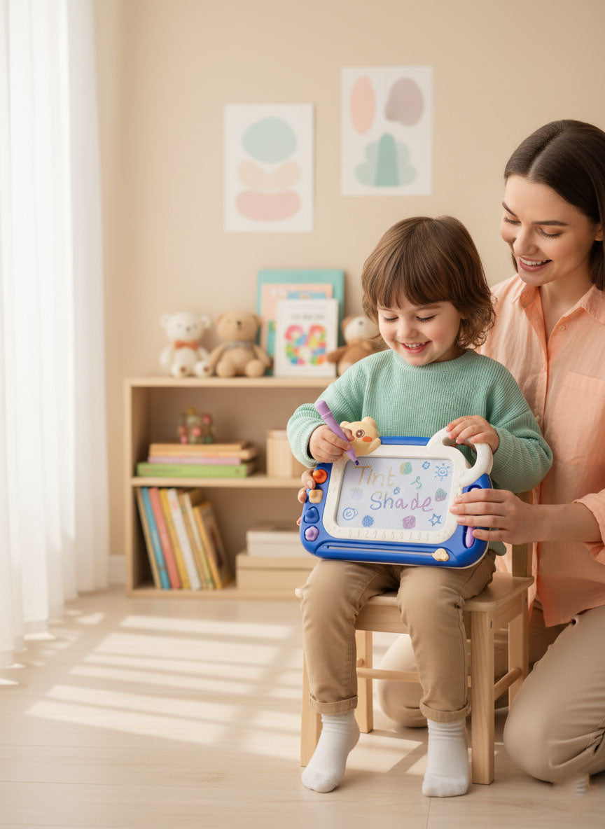 This colorful kids’ magnetic doodle board features a cute bear topper and is perfect for creative play. It comes with a magnetic pen, fun stamps, and an easy slider eraser to clear drawings quickly. Ideal for doodling, learning numbers, and practicing creativity without any mess.