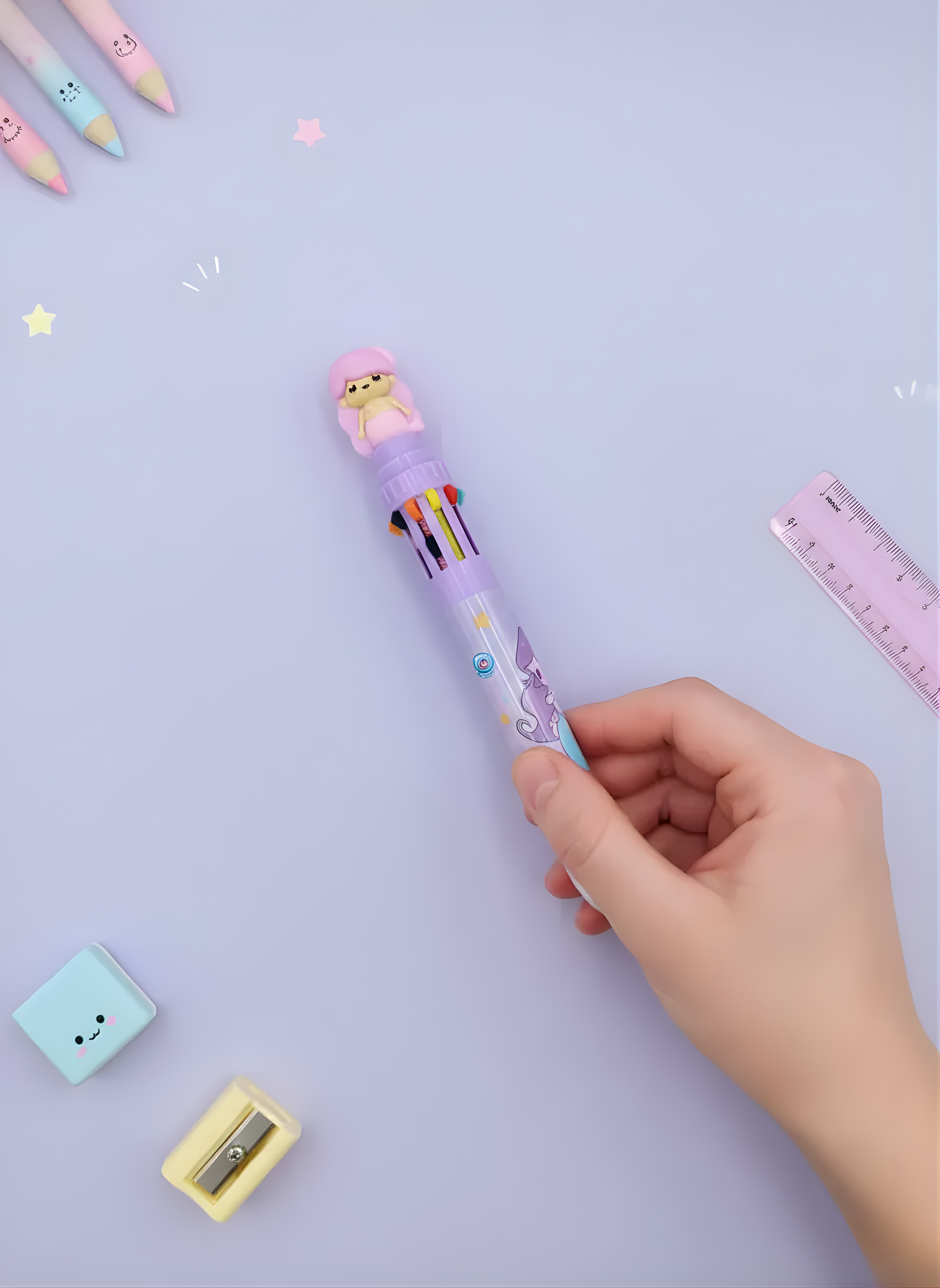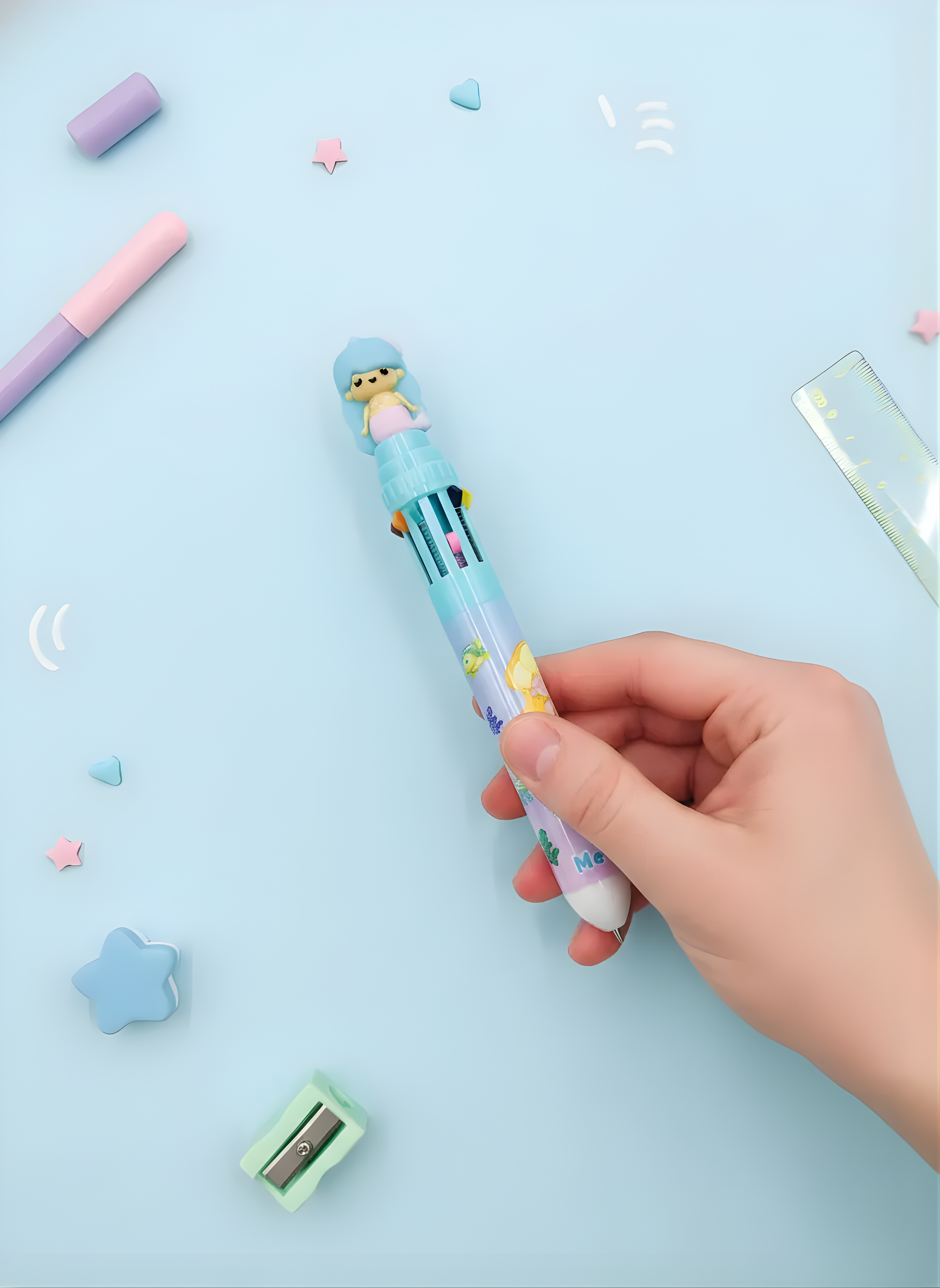The Mermaid Multicolor Pen – Kawaii Pen is a cute and playful 10-in-1 writing pen designed with an adorable Mermaid topper and a pastel mermaid-themed barrel. Packed with multiple ink colors in one pen, it makes writing, doodling, and note-taking fun and convenient. With its soft pastel shades and charming kawaii design, this multicolor pen is perfect for school, journaling, creative work, and adding a delightful touch to any stationery collection.